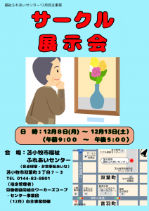 12月自主事業サークル展示会 公開済み: 2025年12月10日更新: 2025年12月10日カテゴリー: イベント 日頃より、苫小牧市福祉ふれあいセンターをご利用いただきましてありがとうございます。 下記日程にて令和7年度12月自主事業を行います。 皆様のご来館をお待ちしております。 内 容:「サークル展示会」 日 時:12月8日(月) ~12月13日(土) 場 所:苫小牧市福祉ふれあいセンター 音卓球室 ロビー特設会場 お問合せ:苫小牧市福祉ふれあいセンター 電話番号:82-8801